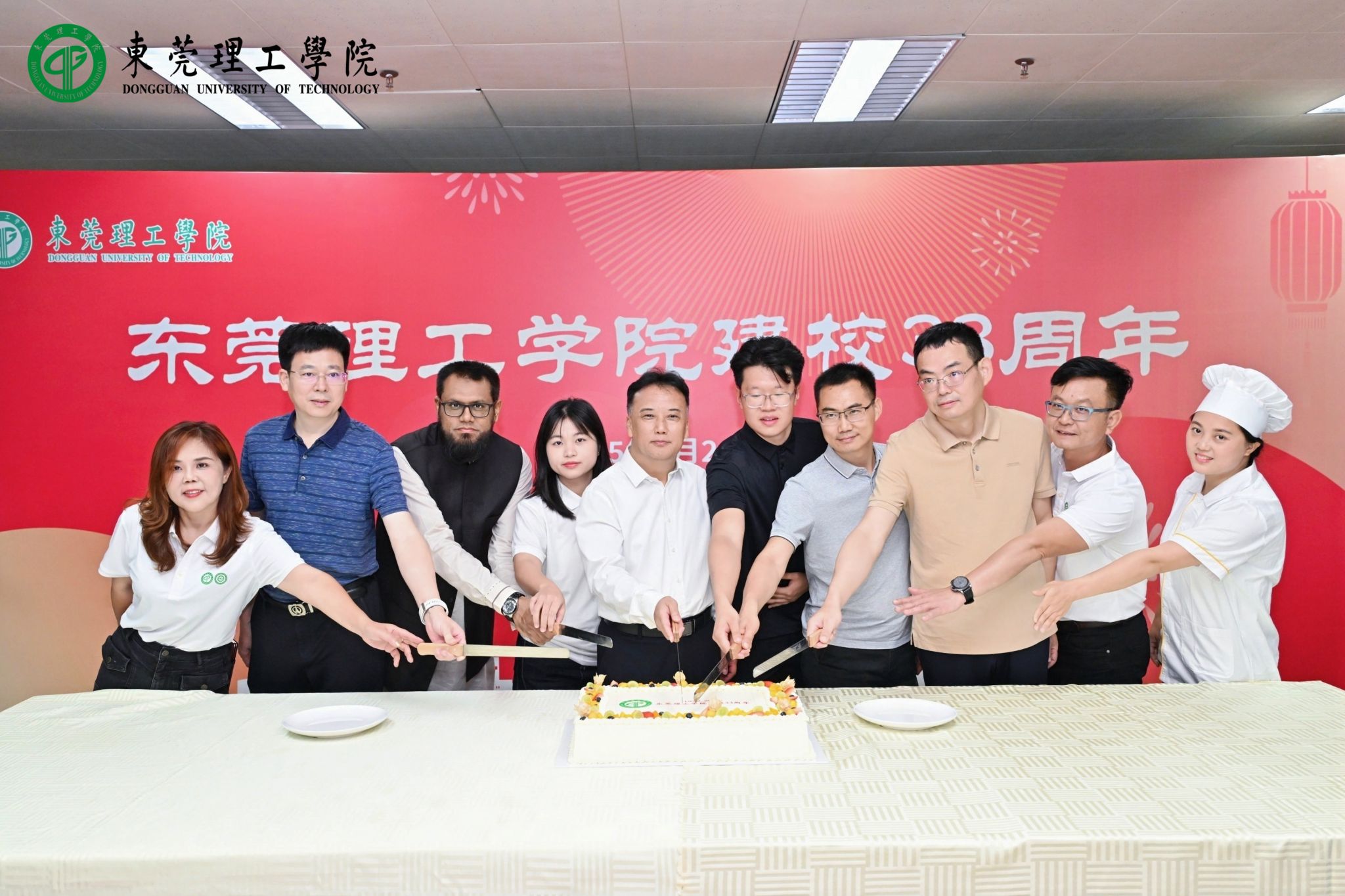 徒步结束后,校友们来到第二饭堂参加建校33周年切蛋糕仪式,与校领导们一起执刀共切校庆蛋糕,共同分享校庆的喜悦,共同书写属于莞工人的精神传承。
