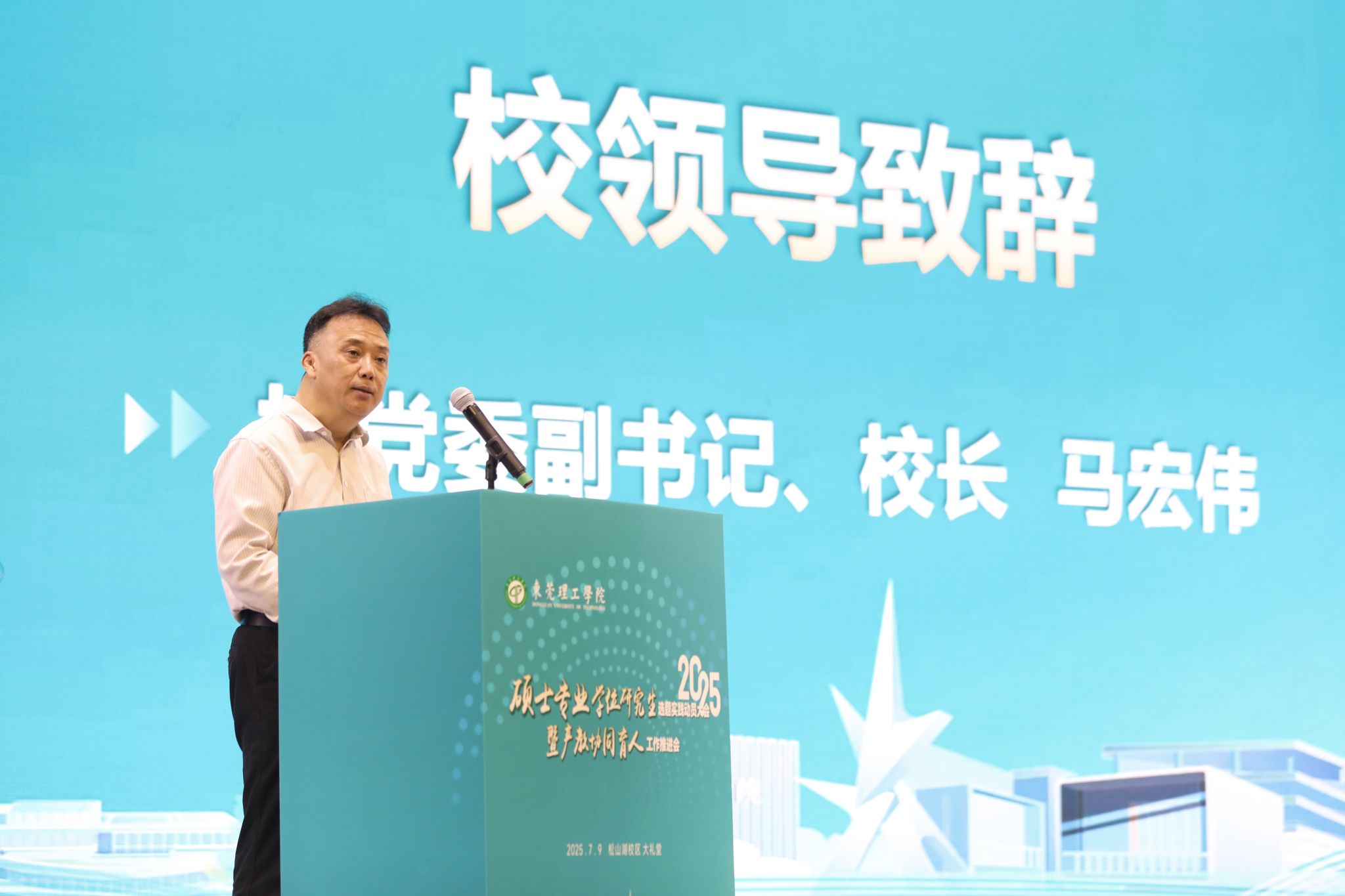 7月9日上午,东莞理工学院2025级硕士专业学位研究生选题实践动员大会暨协同育人工作推进会在松山湖校区礼堂举行,探讨实践育人路径,深化产教融合发展。