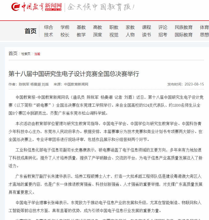 近日,第十八届中国研究生电子设计竞赛(以下简称“研电赛”)全国总决赛在东莞理工学院举行。来自全国高校的524支代表队、约1800名师生从全国8个赛区中脱颖而出,齐聚广东省东莞市松山湖科学城。