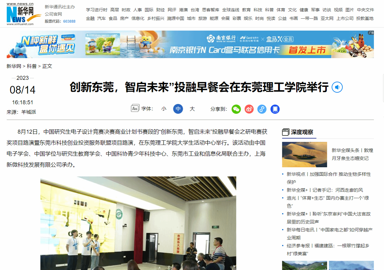 8月12日,中国研究生电子设计竞赛决赛商业计划书赛段的“创新东莞,智启未来”投融早餐会之研电赛获奖项目路演暨东莞市科技创业投资服务联盟项目路演,在东莞理工学院大学生活动中心举行。该活动由中国电子学会、中国学位与研究生教育学会、中国科协青少年科技中心、东莞市工业和信息化局联合主办,上海新微科技发展有限公司承办。