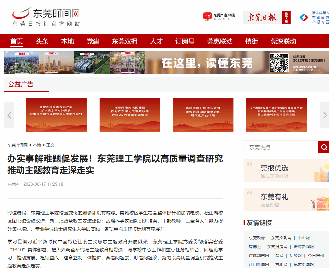 “问渠那得清如许,为有源头活水来。”高质量的调查研究是推动高质量发展的源头活水。下来,东莞理工学院将牢牢把握“学思想、强党性、重实践、建新功”总要求,用好调查研究“传家宝”,紧紧围绕高质量发展这个首要任务,着力答好主题教育“实”字考卷,更好落实立德树人根本任务,推动学校走在高等教育高质量发展前列。