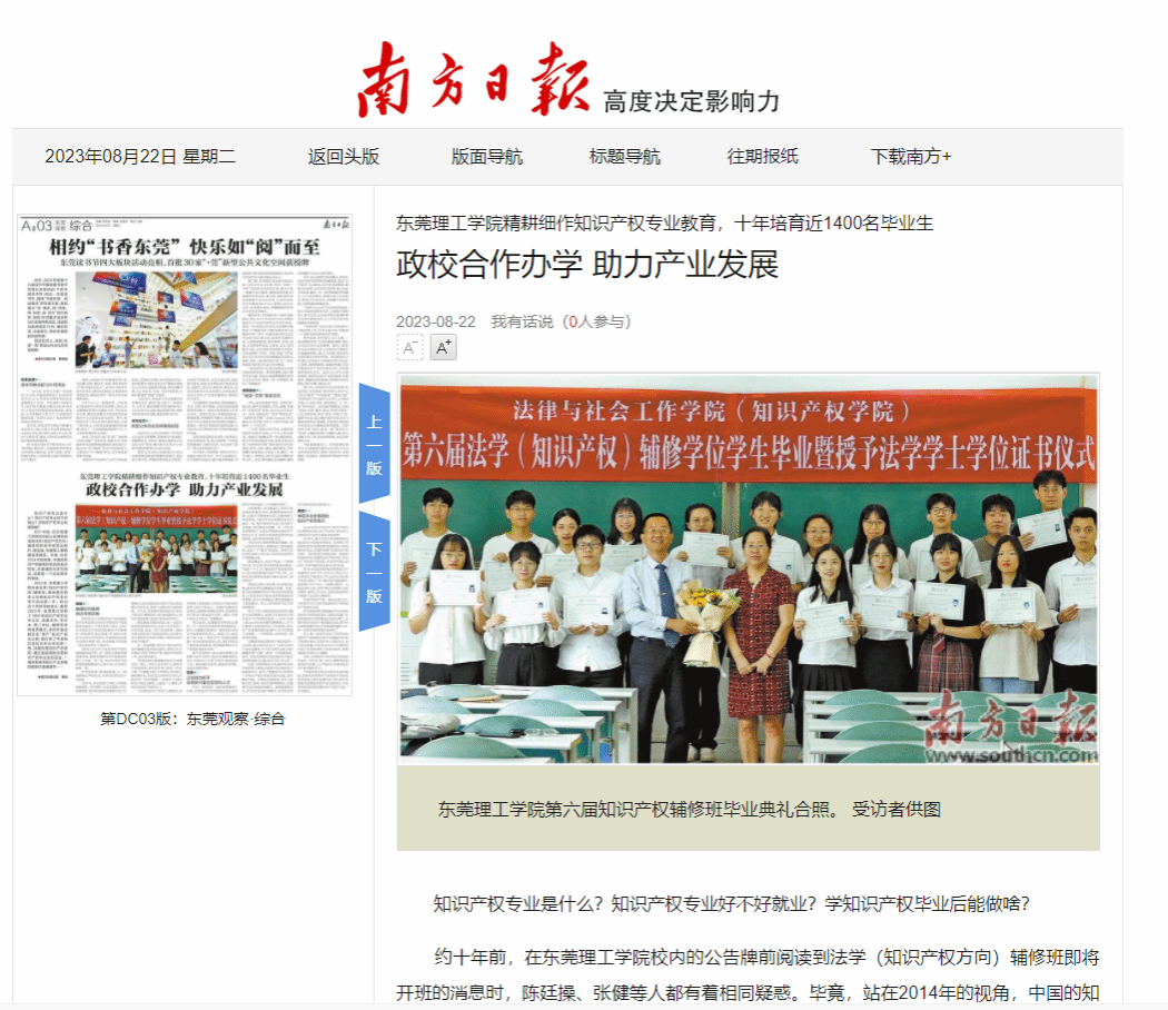 从2014年开办法学(知识产权方向)辅修班开始,约十年时间,东莞本土培育知识产权学子取得丰硕成果。