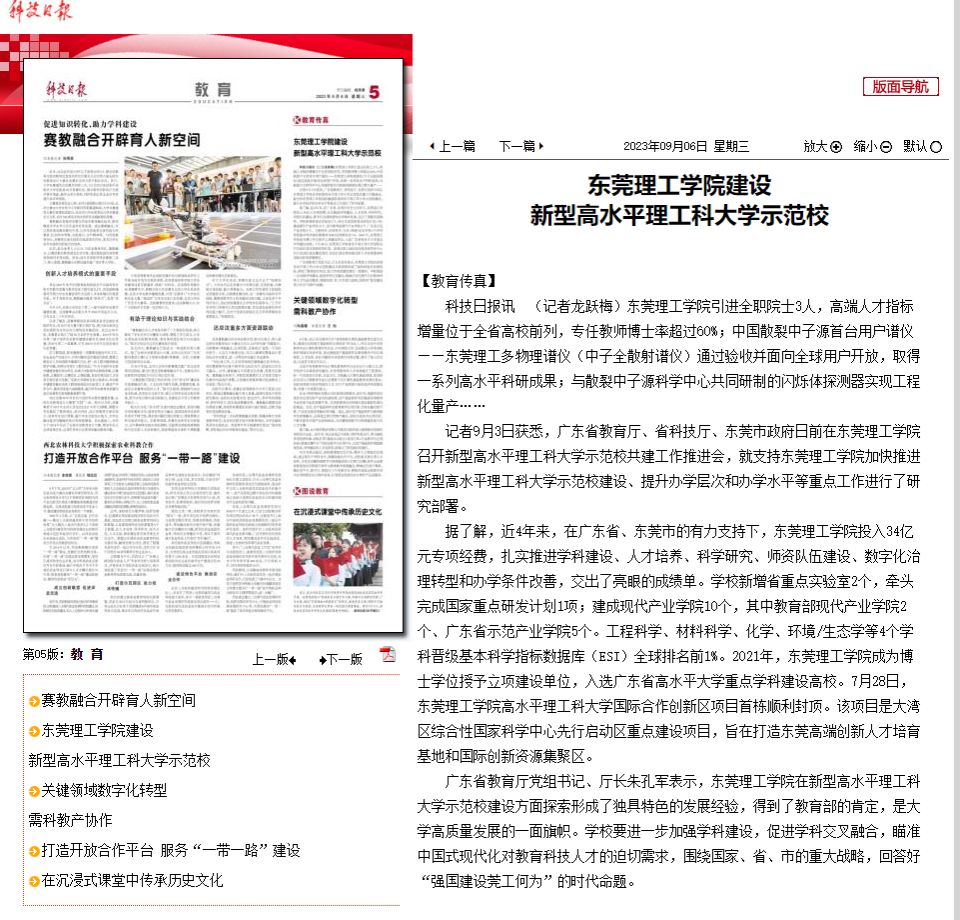 东莞理工学院引进全职院士3人,高端人才指标增量位于全省高校前列,专任教师博士率超过60%;中国散裂中子源首台用户谱仪——东莞理工多物理谱仪(中子全散射谱仪)通过验收并面向全球用户开放,取得一系列高水平科研成果;与散裂中子源科学中心共同研制的闪烁体探测器实现工程化量产……