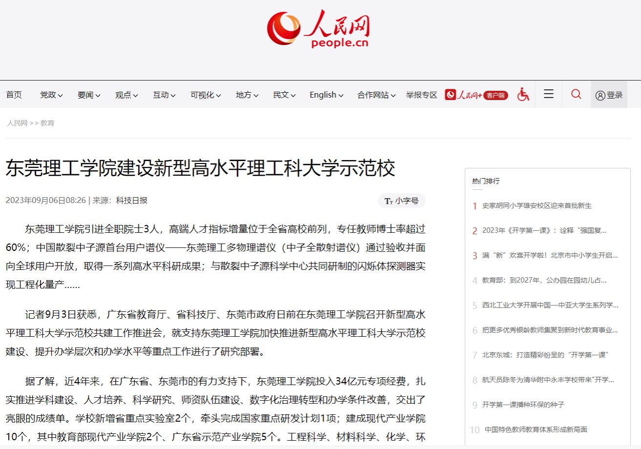 东莞理工学院引进全职院士3人,高端人才指标增量位于全省高校前列,专任教师博士率超过60%;中国散裂中子源首台用户谱仪——东莞理工多物理谱仪(中子全散射谱仪)通过验收并面向全球用户开放,取得一系列高水平科研成果;与散裂中子源科学中心共同研制的闪烁体探测器实现工程化量产……