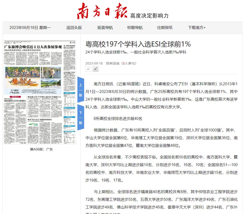 近日,科睿唯安公布了ESI(基本科学指标)从2013年1月1日—2023年6月30日的统计数据。广东25所高校共有197个学科入选全球前1%,其中24个学科入选全球前1‰。中山大学的一般社会科学新晋前1‰,这是广东高校首次有该学科入选,此前全国该学科入选前1‰的高校仅有北京大学。
