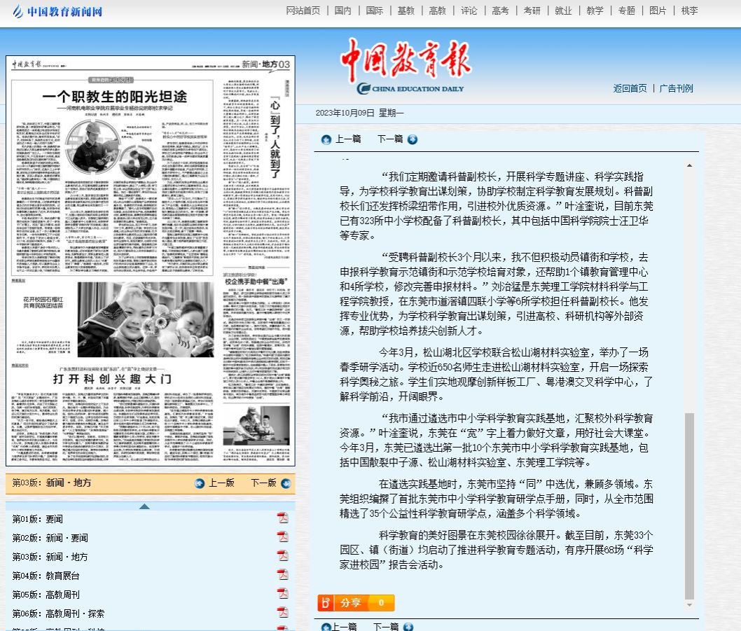 科学教育的美好图景在东莞校园徐徐展开。截至目前,东莞33个园区、镇(街道)均启动了推进科学教育专题活动,有序开展68场“科学家进校园”报告会活动。