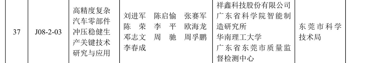 长安的祥鑫科技股份有限公司与广东省科学院智能制造研究所、华南理工大学、广东省东莞市质量监督检测中心,联合完成“高精度复杂汽车零部件冲压稳健生产关键技术研究与应用”项目,获科技进步奖。