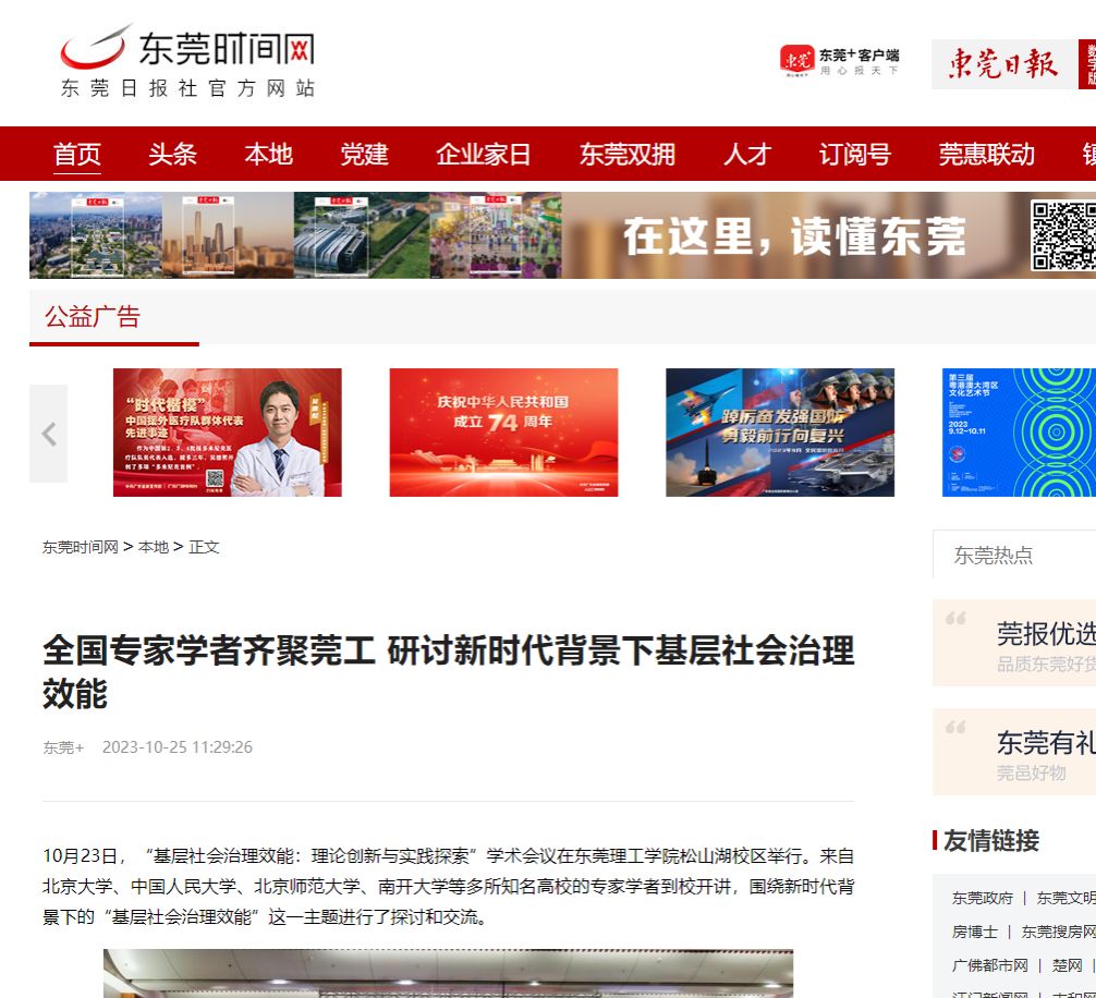 10月23日,“基层社会治理效能:理论创新与实践探索”学术会议在东莞理工学院松山湖校区举行。来自北京大学、中国人民大学、北京师范大学、南开大学等多所知名高校的专家学者到校开讲,围绕新时代背景下的“基层社会治理效能”这一主题进行了探讨和交流。