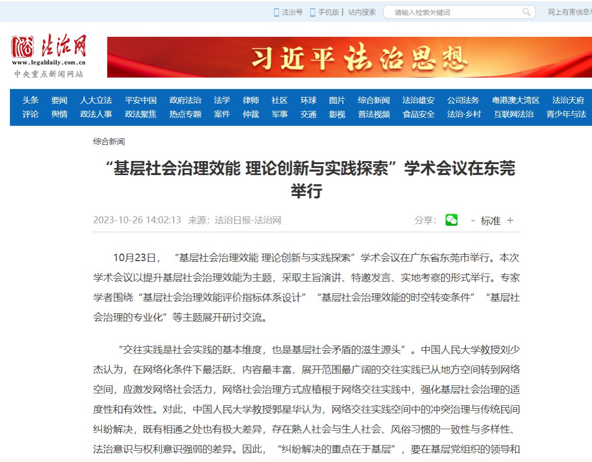 10月23日, “基层社会治理效能 理论创新与实践探索”学术会议在广东省东莞市举行。本次学术会议以提升基层社会治理效能为主题,采取主旨演讲、特邀发言、实地考察的形式举行。专家学者围绕“基层社会治理效能评价指标体系设计”“基层社会治理效能的时空转变条件”“基层社会治理的专业化”等主题展开研讨交流。