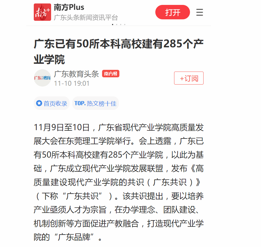 11月9日至10日,广东省现代产业学院高质量发展大会在东莞理工学院举行。会上透露,广东已有50所本科高校建有285个产业学院,以此为基础,广东成立现代产业学院发展联盟,发布《高质量建设现代产业学院的共识(广东共识)》(下称“广东共识”)。该共识提出,要以培养产业亟须人才为宗旨,在办学理念、团队建设、机制创新等方面促进产教融合,打造现代产业学院的“广东品牌”。