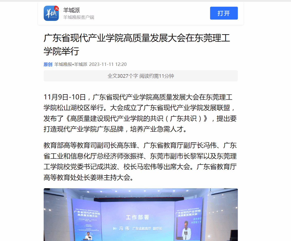 11月9日-10日,广东省现代产业学院高质量发展大会在东莞理工学院松山湖校区举行。大会成立了广东省现代产业学院发展联盟,发布了《高质量建设现代产业学院的共识(广东共识)》,提出要打造现代产业学院广东品牌,培养产业急需人才。