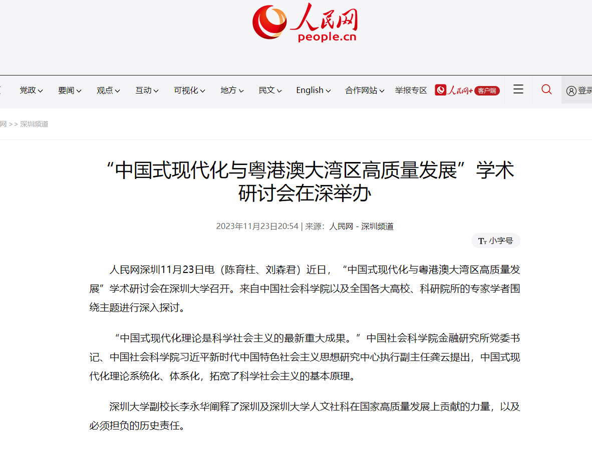 人民网深圳11月23日电(陈育柱、刘森君)近日,“中国式现代化与粤港澳大湾区高质量发展”学术研讨会在深圳大学召开。来自中国社会科学院以及全国各大高校、科研院所的专家学者围绕主题进行深入探讨。