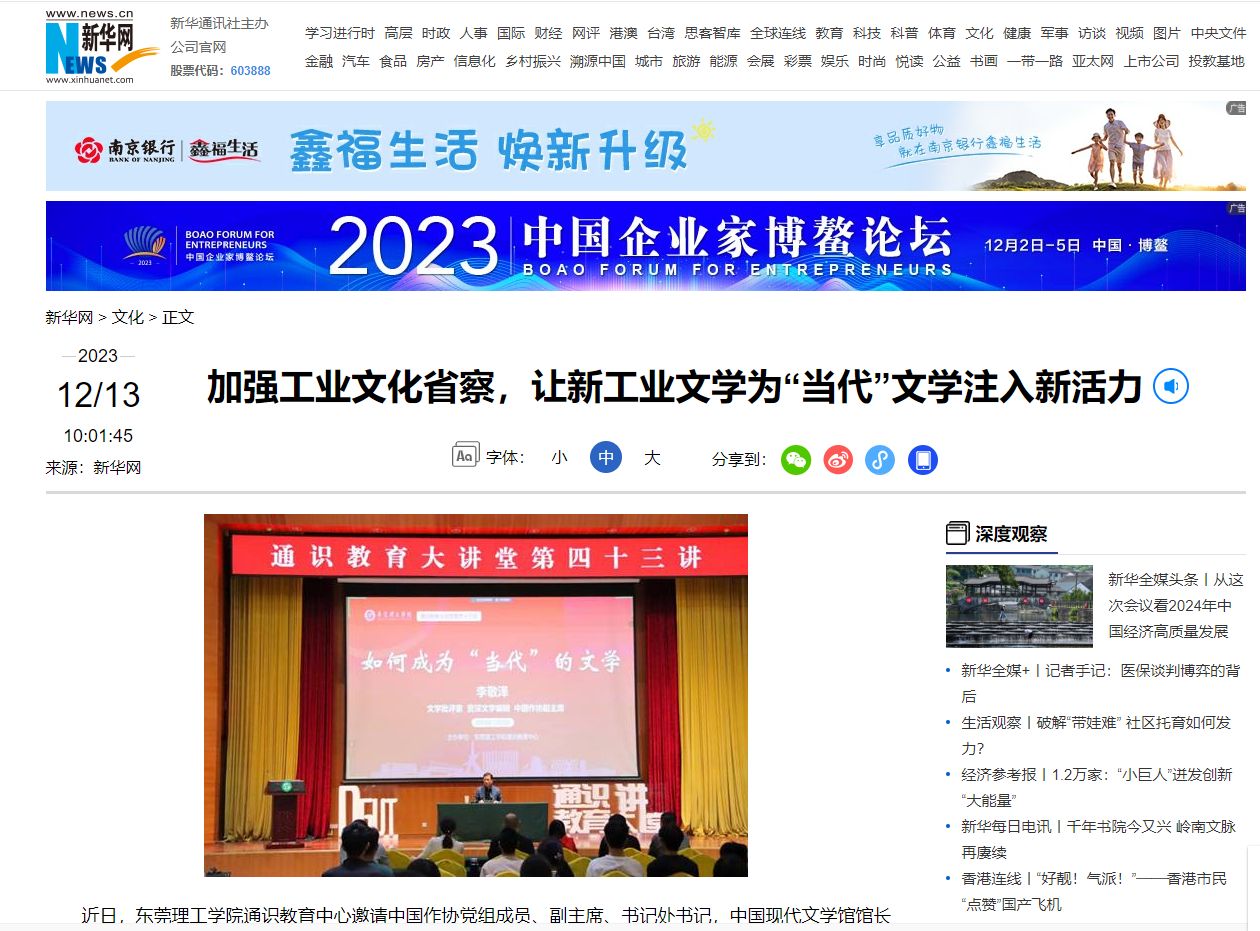 近日,东莞理工学院通识教育中心邀请中国作协党组成员、副主席、书记处书记,中国现代文学馆馆长李敬泽为该校的同学们作“如何成为‘当代’的文学”主题讲座。本次讲座由东莞理工学院教务处副处长许燕转主持,当天线上线下吸引了近5000名观众观看。本次讲座还邀请了《花城》杂志社社长张懿、《作品》杂志社社长、主编王十月,《作品》杂志副主编郑小琼、《广州文艺》副主编陈崇正 ,东莞市作协主席胡磊,以及柳冬妩、塞壬、许晓雯、穆肃等东莞作家。