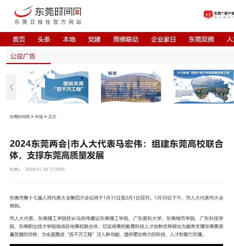 市人大代表、东莞理工学院校长马宏伟建议东莞理工学院、广东医科大学、东莞城市学院、广东科技学院、东莞职业技术学院组成在地高校联合体,切实将高校教育科技人才创新优势转化为服务支撑东莞高质量发展的优势,为全面推进“百千万工程”注入新动能,提供更加有力的科技、人才和智力支撑。