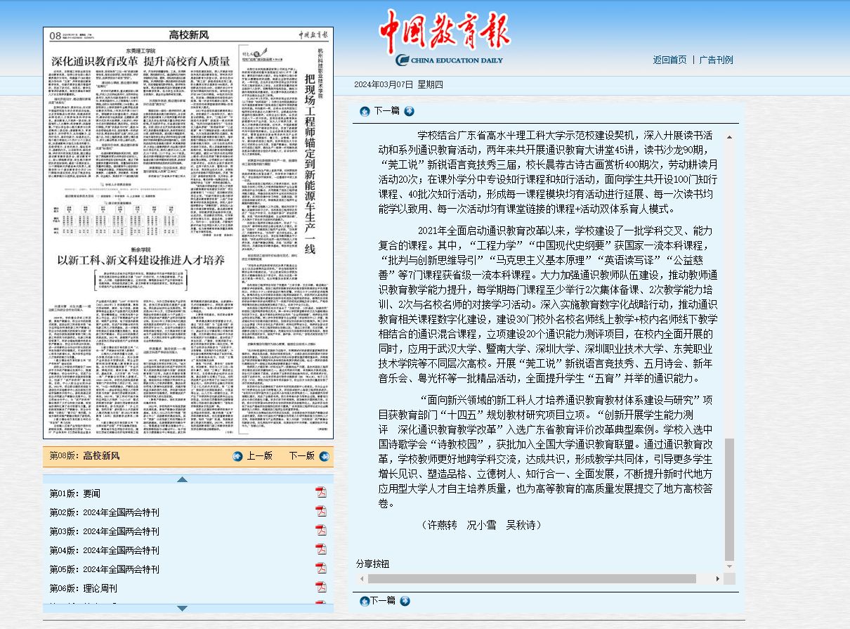 “面向新兴领域的新工科人才培养通识教育教材体系建设与研究”项目获教育部门“十四五”规划教材研究项目立项。“创新开展学生能力测评 深化通识教育教学改革”入选广东省教育评价改革典型案例。学校入选中国诗歌学会“诗教校园”,获批加入全国大学通识教育联盟。通过通识教育改革,学校教师更好地跨学科交流,达成共识,形成教学共同体,引导更多学生增长见识、塑造品格、立德树人、知行合一、全面发展,不断提升新时代地方应用型大学人才自主培养质量,也为高等教育的高质量发展提交了地方高校答卷。