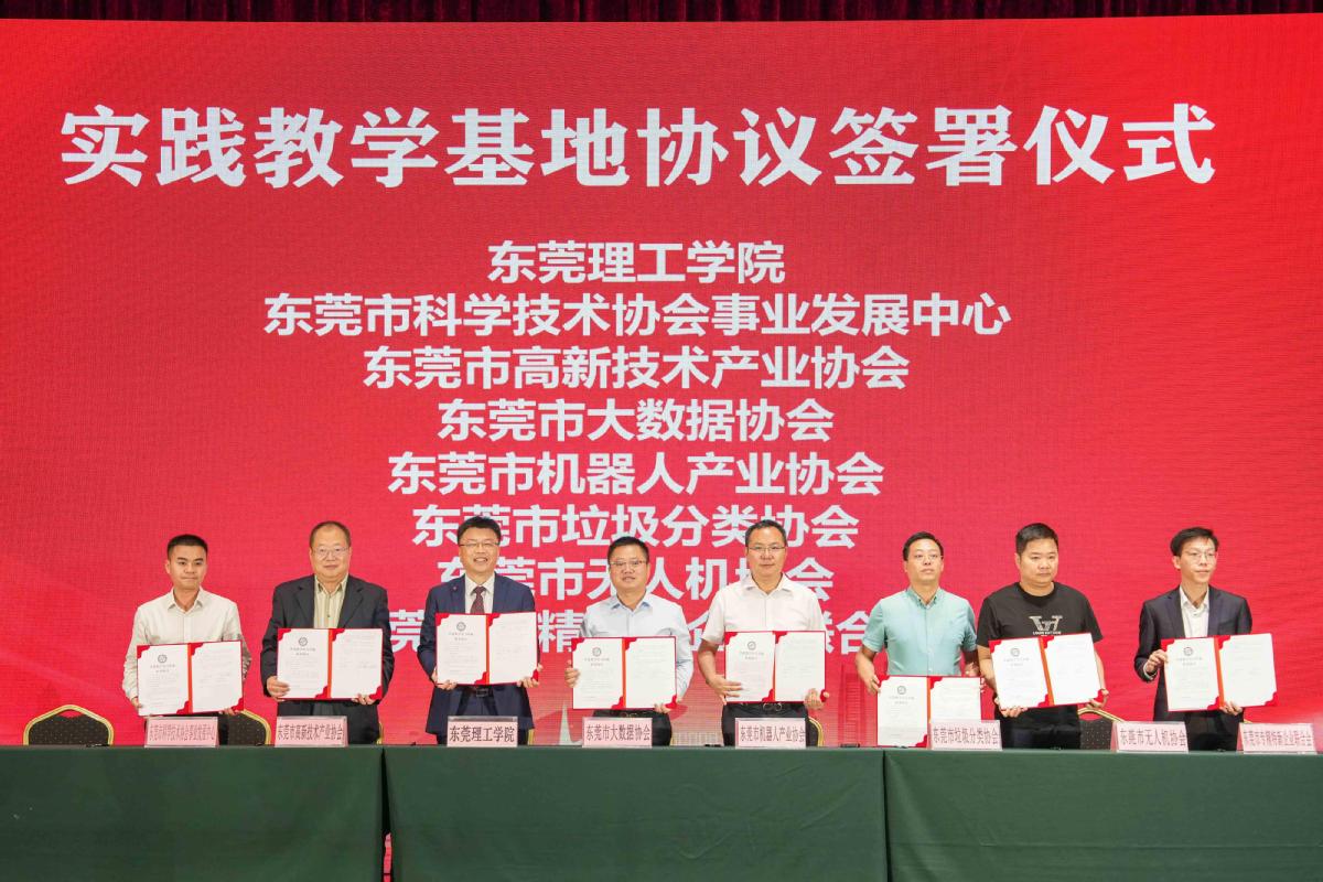 活动现场,东莞理工学院与东莞市台商投资企业协会、科大讯飞股份有限公司、联想(深圳)电子有限公司、东莞信易电热机械有限公司、广东红珊瑚药业有限公司、达闼机器人股份有限公司,立迪科技有限公司等7家企业、协会签署战略合作框架协议,并与27家企业、协会签订实践教学基地协议。