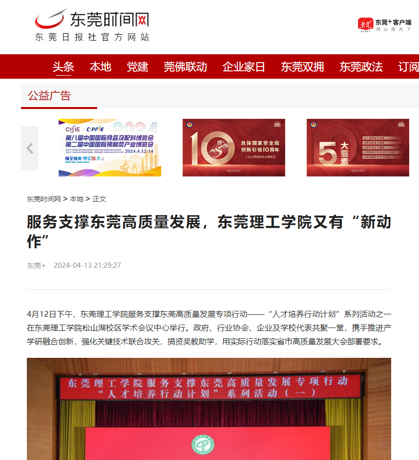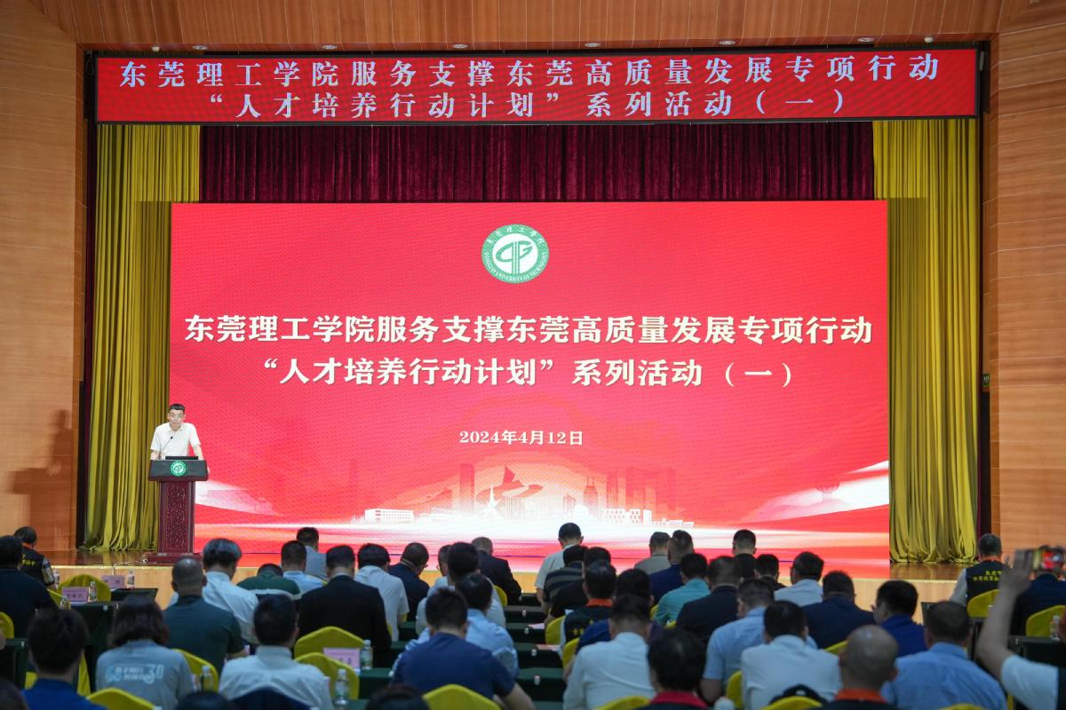 4月12日下午,东莞理工学院服务支撑东莞高质量发展专项行动——“人才培养行动计划”系列活动之一在东莞理工学院松山湖校区学术会议中心举行。政府、行业协会、企业及学校代表共聚一堂,携手推进产学研融合创新,强化关键技术联合攻关,捐资奖教助学,用实际行动落实省市高质量发展大会部署要求。