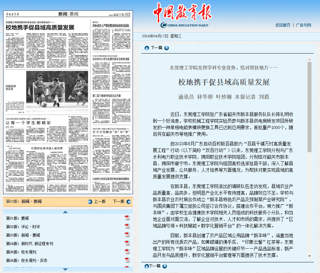 自2023年8月广东启动百校联百县助力“百县千镇万村高质量发展工程”行动(以下简称“双百行动”)以来,东莞理工学院分别与广东水利电力职业技术学院、揭阳职业技术学院组团,分别结对韶关市新丰县、揭阳市普宁市。东莞理工学院与组团高校选派驻县干部,深入了解县域产业发展、公共服务、人才培养等方面情况,为帮扶对象实现县域的高质量发展提供支撑。