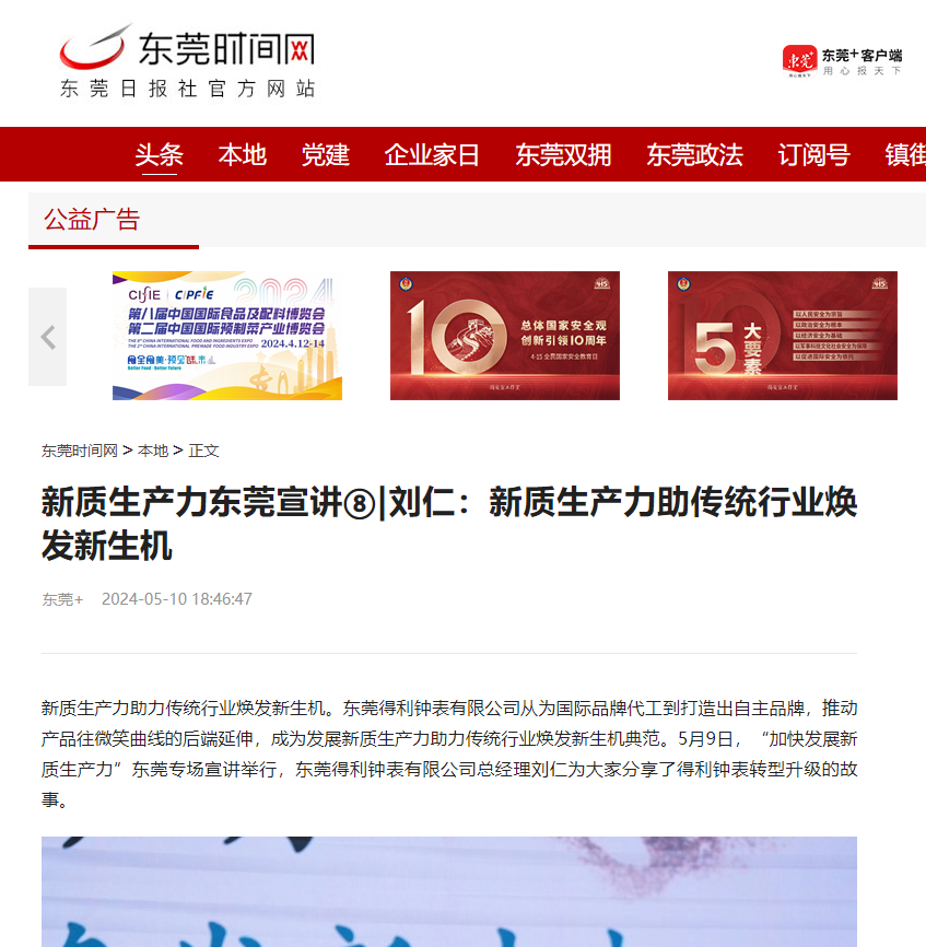 新质生产力助力传统行业焕发新生机。东莞得利钟表有限公司从为国际品牌代工到打造出自主品牌,推动产品往微笑曲线的后端延伸,成为发展新质生产力助力传统行业焕发新生机典范。5月9日,“加快发展新质生产力”东莞专场宣讲举行,东莞得利钟表有限公司总经理刘仁为大家分享了得利钟表转型升级的故事。