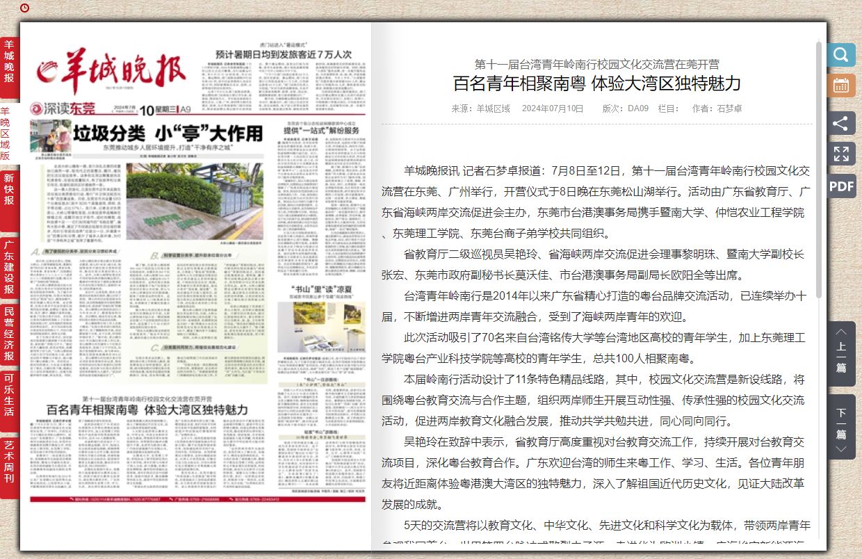7月8日至12日,第十一届台湾青年岭南行校园文化交流营在东莞、广州举行,开营仪式于8日晚在东莞松山湖举行。活动由广东省教育厅、广东省海峡两岸交流促进会主办,东莞市台港澳事务局携手暨南大学、仲恺农业工程学院、东莞理工学院、东莞台商子弟学校共同组织。