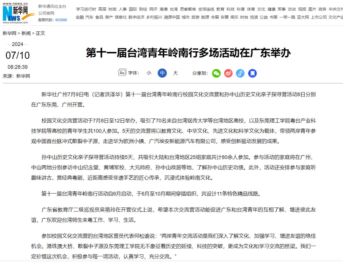 校园文化交流营活动于7月8日至12日举办,吸引了70名来自台湾铭传大学等台湾地区高校,以及东莞理工学院粤台产业科技学院等高校的青年学生共100人参加。5天的交流营将以教育文化、中华文化、先进文化和科学文化为载体,带领两岸青年参观中国首台脉冲式散裂中子源,走进华为欧洲小镇、广汽埃安新能源汽车有限公司,感受创新驱动发展的成果。