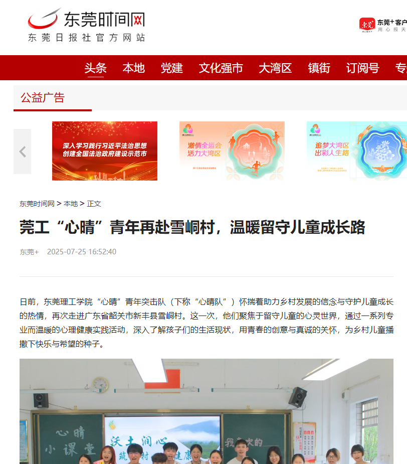 “心晴队”的雪峒之行,生动诠释了青年学子反哺乡土、关爱未来的责任担当。每一次俯身倾听、每一个温暖的互动,都如涓涓细流,滋润着乡村儿童的心田,悄然为他们注入前行的力量。心之所向,情系乡野;行之所往,护航童真。莞工“心晴”青年的脚步,正在为乡村的振兴之路,增添一抹温暖而坚定的青春亮色。