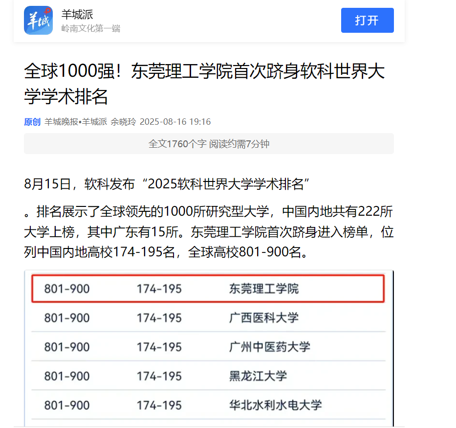 8月15日,软科发布“2025软科世界大学学术排名”。排名展示了全球领先的1000所研究型大学,中国内地共有222所大学上榜,其中广东有15所。东莞理工学院首次跻身进入榜单,位列中国内地高校174-195名,全球高校801-900名。