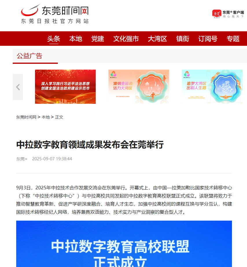 9月3日,2025年中拉技术合作发展交流会在东莞举行。开幕式上,由中国—拉美加勒比国家技术转移中心(下称“中拉技术转移中心”)与中拉高校共同发起的中拉数字教育高校联盟正式成立。该联盟将致力于推动智慧教育革新、促进产学研深度融合、培育人才生态,加强中拉高校间的课程互换与学分互认,构建国际技术转移经纪人网络,培养兼具双语能力、技术实力与产业洞察的复合型人才。