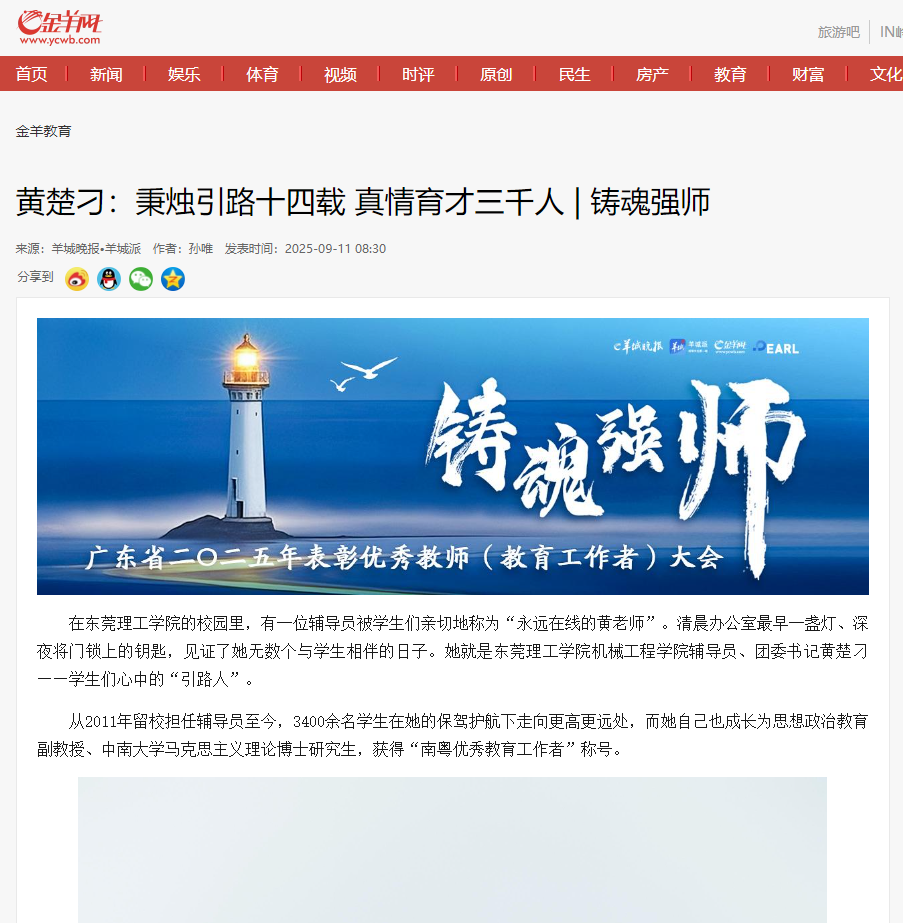 在东莞理工学院的校园里,有一位辅导员被学生们亲切地称为“永远在线的黄老师”。清晨办公室最早一盏灯、深夜将门锁上的钥匙,见证了她无数个与学生相伴的日子。她就是东莞理工学院机械工程学院辅导员、团委书记黄楚刁——学生们心中的“引路人”。