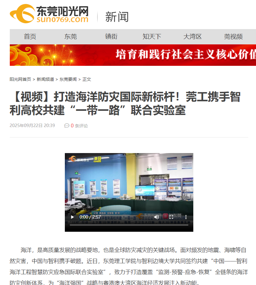 联合实验室不仅是科技合作的桥梁,更是东莞理工学院国际化战略的重要实践。据了解,近年来东莞理工学院秉持“以我为主、开放共赢”的国际化办学理念,积极融入共建“一带一路”高质量发展。东莞理工学院已与墨西哥、巴西、阿根廷、厄瓜多尔、古巴、乌拉圭、秘鲁、智利等8个国家共14所拉美高校及研究机构达成合作。未来,联合实验室不仅能培养更多高校复合型创新科研人才,还将成为中智两国乃至中国与拉美国家海洋科技合作的重要标杆,为人类应对海洋灾害贡献“中国方案”。