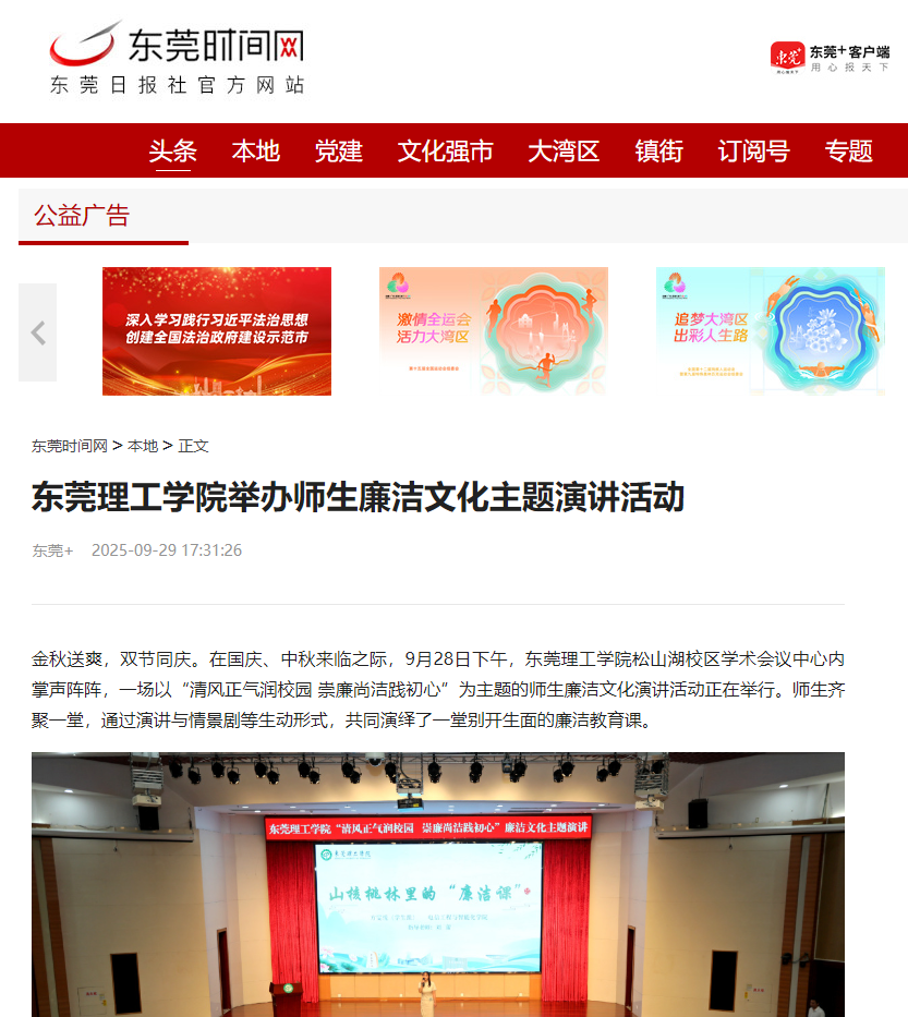 本次演讲活动是学校继去年廉洁教育文艺党课后,推出的又一廉洁文化主题教育力作,充分展现了东莞理工学院在廉洁文化建设上的持续创新与显著成效。