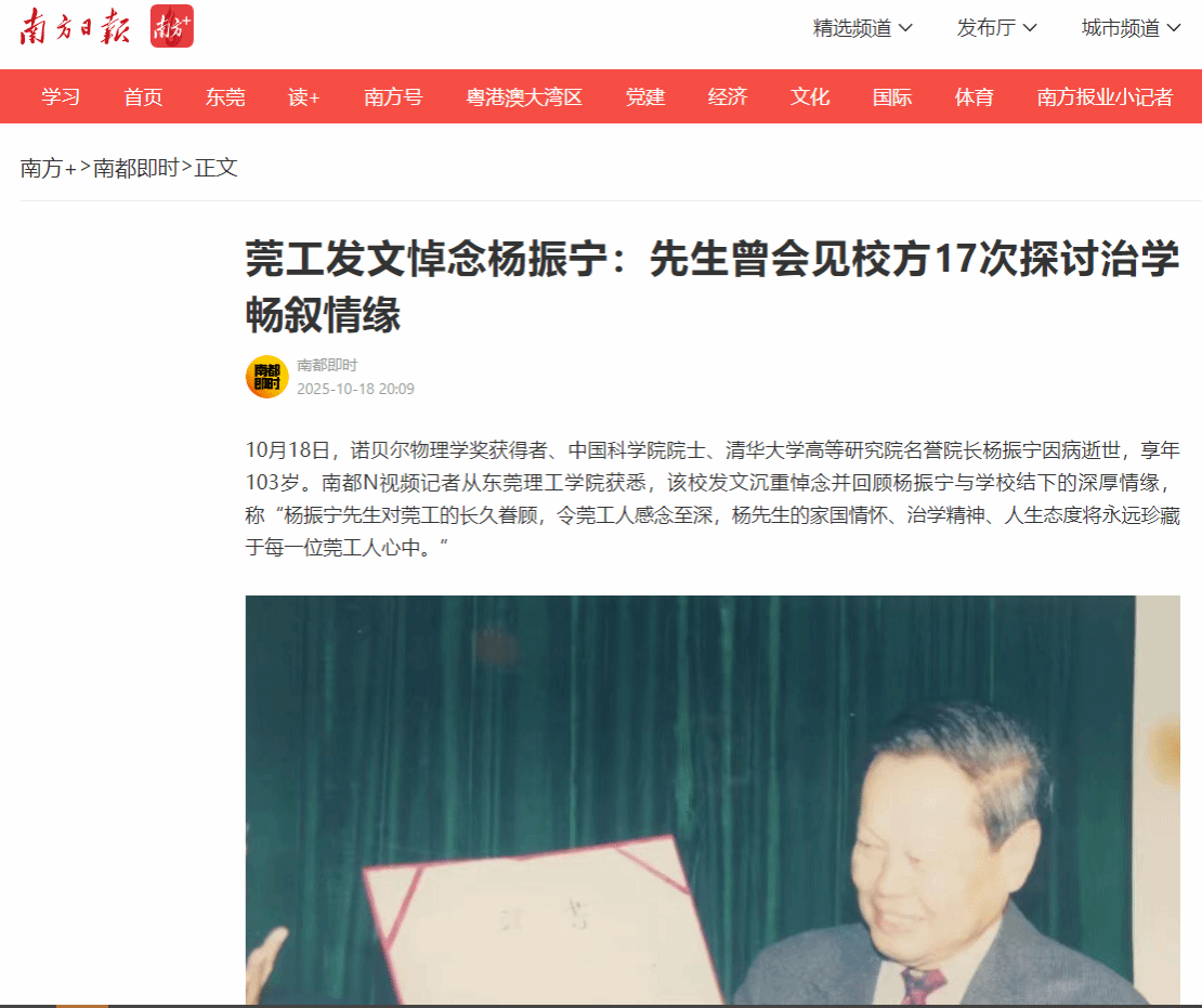 10月18日,诺贝尔物理学奖获得者、中国科学院院士、清华大学高等研究院名誉院长杨振宁因病逝世,享年103岁。南都N视频记者从东莞理工学院获悉,该校发文沉重悼念并回顾杨振宁与学校结下的深厚情缘,称“杨振宁先生对莞工的长久眷顾,令莞工人感念至深,杨先生的家国情怀、治学精神、人生态度将永远珍藏于每一位莞工人心中。”
