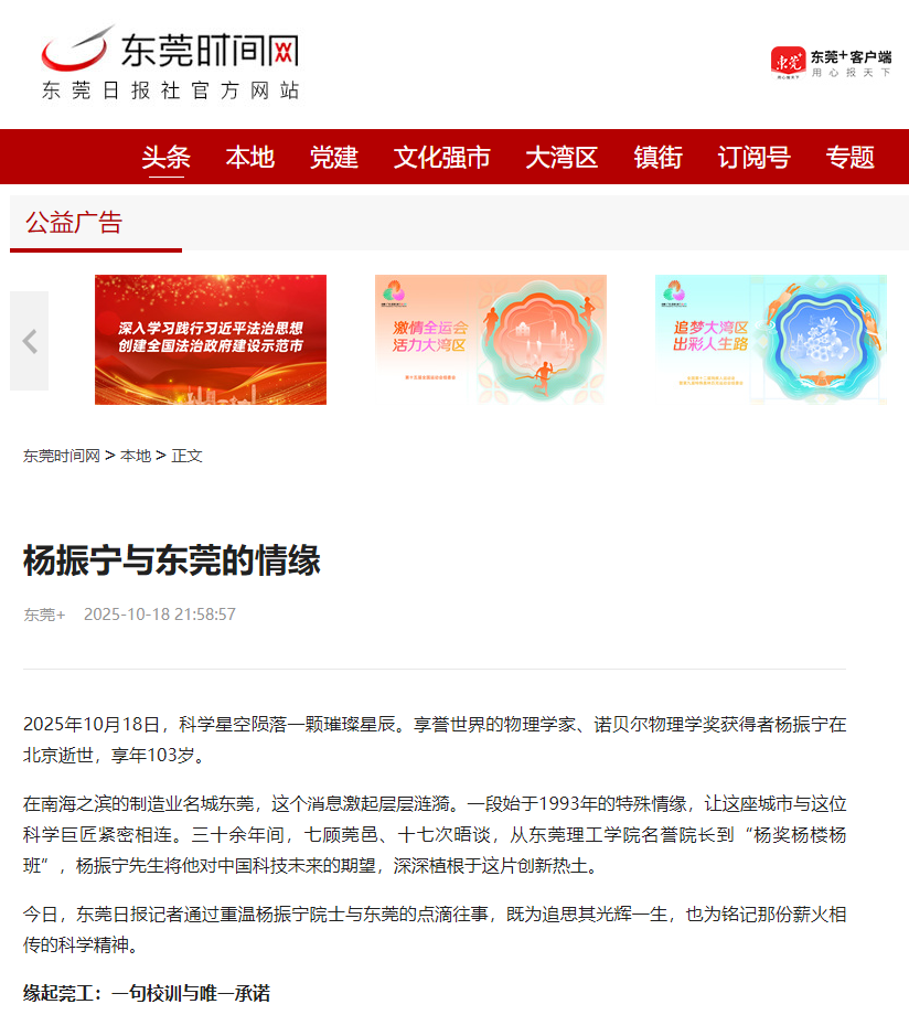 今日,东莞日报记者通过重温杨振宁院士与东莞的点滴往事,既为追思其光辉一生,也为铭记那份薪火相传的科学精神。