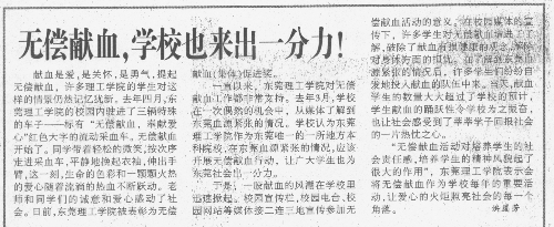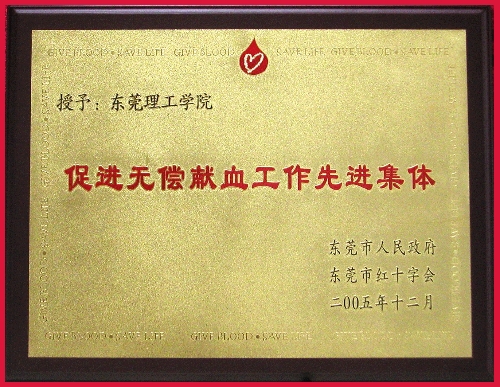 献血是爱,是关怀,是勇气,提起无偿献血,许多理工学院的学生对这样子的情景仍然记忆犹新。去年四月,东莞理工学院的校园内驶进了三辆特殊的车子——标有“无偿献血,奉献爱心”红色大字的流动采血车。无偿献血开始了,同学带着轻松的微笑,按次序起进采血车,平静地挽起衣袖,伸出手臂,这一刻,生命的色彩和一颗颗火热的爱心随着热血不断跃动。老师和同学们的诚意和爱心感动了社会。日前,东莞理工学院被表彰为无偿献血(集体)促进奖。