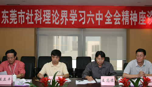 10月26日,东莞市委宣传部、东莞理工学院、东莞市委党校等三家单位联合举办的“东莞市社科界学习十六届六中全会精神座谈会”在东莞市行政办事中心举行,东莞市社科联专职副主席王思煜、我院党委副书记王江水,政法系主任李洪君教授等东莞市社科界人士参加了座谈。