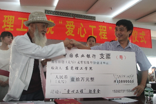 11月3日,温远达先生向东莞理工学院“爱心工程”捐款仪式在我院举行。本次仪式上,温远达先生将通过举行“立德树人 和谐东莞” ——九旬书画家温远达(愚叟)爱心助学书画义卖拍卖会所筹得的十万元善款捐赠给我院“爱心工程”助学活动,以资助我院十名2006级家庭经济困难学生。 我院党委王江水副书记,市民政局副局长、市慈善会副会长袁佩霞女士,温远达先生及义卖拍卖活动各主办单位与协办单位有关负责人出席了当天的捐赠仪式。