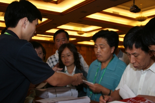 学生处工作人员为年会的顺利举行而辛苦工作,图为向与会代表派发文件