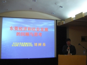 应北京大学团委的邀请,东莞市委副书记兼学院党委书记刘树基11月17日在北京大学为该校团干作了题为《东莞经济和社会发展的回顾与思考》的报告。报告分析了东莞快速发展的社会因素,介绍了东莞发展市场经济的独特经验和做法。全国青联副主席、全国学联主席刘凯主持了报告会。刘书记精彩的演讲吸引了北大学子。在半个小时的提问期间,北大学子踊跃提问,刘书记精彩而幽默的回答引来阵阵掌声和笑声,气氛热烈。报告会结束后,北京大学团委副书记张小萌与刘书记互赠了礼物。 11月18日,刘书记还在北京出席了由中国人民大学商学院、《21世纪商业评论》、百度公司、新浪财经、彼得.德鲁克管理学院等机构联合举办的“首届中国彼得.德鲁克高层管理论坛”,并于19日下午在论坛上作了题为“东莞发展中的政府管理与有效决策”的演讲。刘书记的演讲介绍了东莞经验和做法,阐述了一切从实际出发、遵循人性化和市场经济原则等管理理念,并强调注重决策和管理实践的有效性。据了解,“首届中国彼得.德鲁克高层管理论坛”邀请了德鲁克先生遗孀Doris Drucker博士以及韩国、台湾、香港等地知名的德鲁克管理专家和国内知名的企业界人士、高校教授共约300余人参加,刘书记是此次论坛邀请的唯一一位在论坛上演讲的党政部门领导。