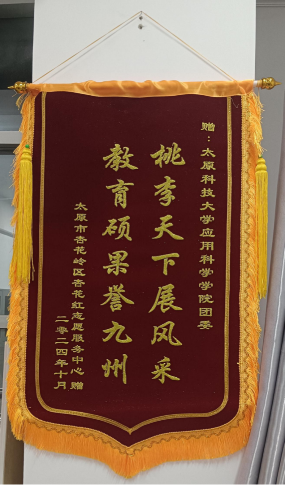 2024年10月17日,太原市杏花岭区杏花红服务中心张建中队长将一面绣有“桃李天下展风采,教育硕果誉九州”十四个鎏金大字的锦旗赠予我院团委,以表达对我院持续开展志愿服务的深深谢意。