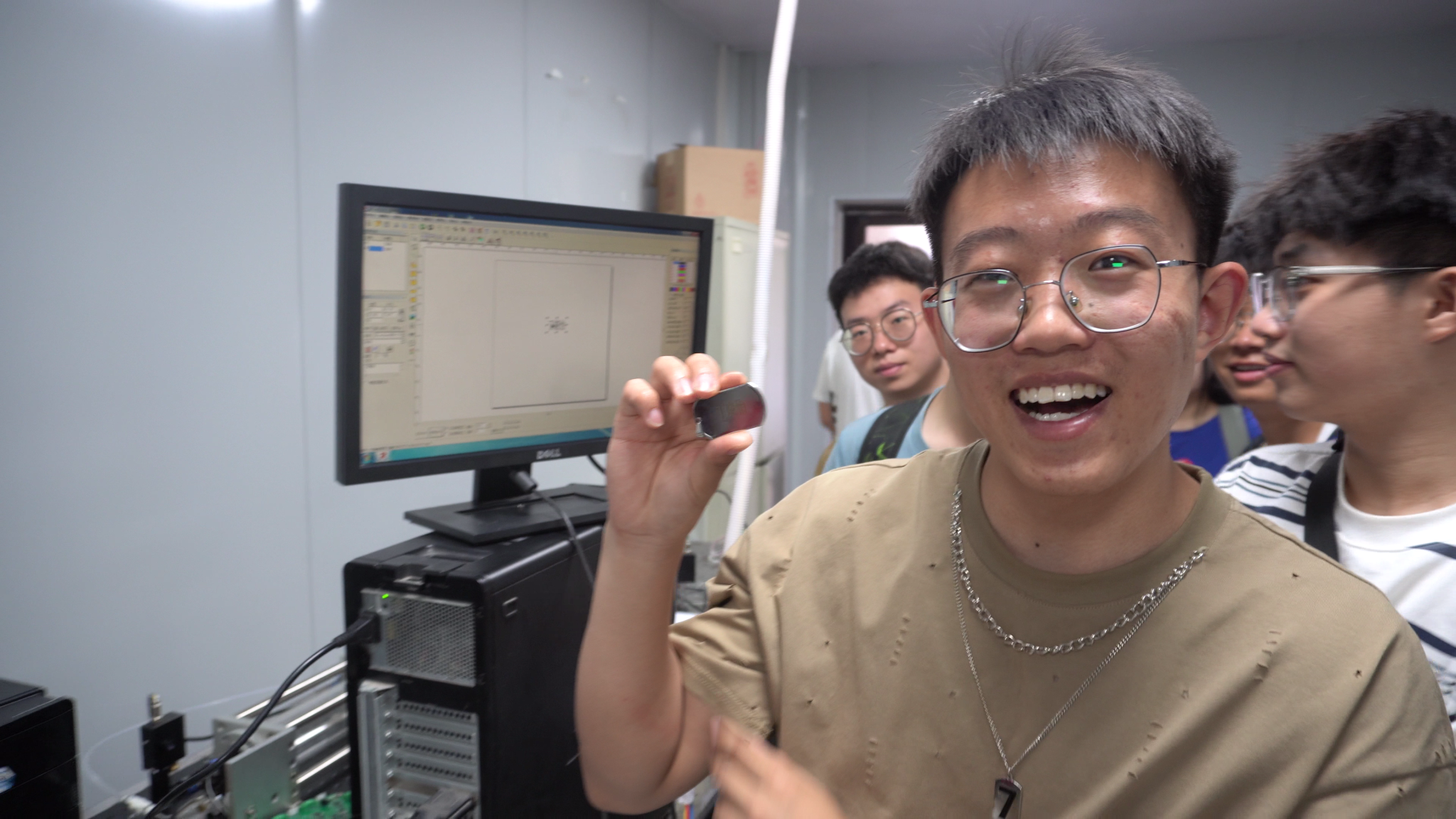 科普体验活动设置了“激光打标”、“VR虚拟眼镜”、“SiC电致发光”三个环节。学生们进行了参观和沉浸式体验,了解了多种光学实验的原理及应用,并亲手用激光打标机制作了自己设计的图章。
