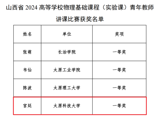 我院教师宫廷、周月婷在山西省2024年高等学校物理基础课程(实验课)青年教师讲课比赛中荣获佳绩