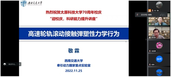 2022年11月25日,太原科技大学应用科学学院成功举办“迎校庆,科研能力提升系列讲座”专题报告会。报告会由太原科技大学党委宣传部、科学技术研究院主办、应用科学学院承办,邀请到西南交通大学牵引动力国家重点实验室国家优秀青年基金获得者敬霖研究员在线上作了题为《高速轮轨滚动接触弹塑性力学行为》的精彩学术报告。报告会由应用科学学院院长林金保教授主持。