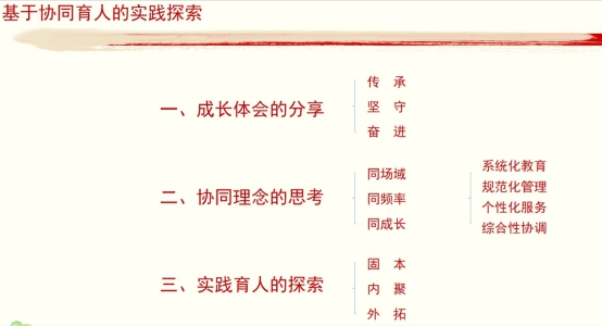 讲座上,李睿结合自身的工作经历,分享了他个人的成长体验,从中阐述了辅导员工作的传承、坚守和奋进。他重点结合自己的实践探索,用一个个生动的案例分享了关于“协同理念的思考”以及“实践育人的探索”。李睿提出,协同理念的核心要义是“同场域、同频率、同成长”;在协同育人过程中,要注重系统化教育、规范化管理、个性化服务及综合性协调;实践育人的本质在于“固本、内聚、外拓”。