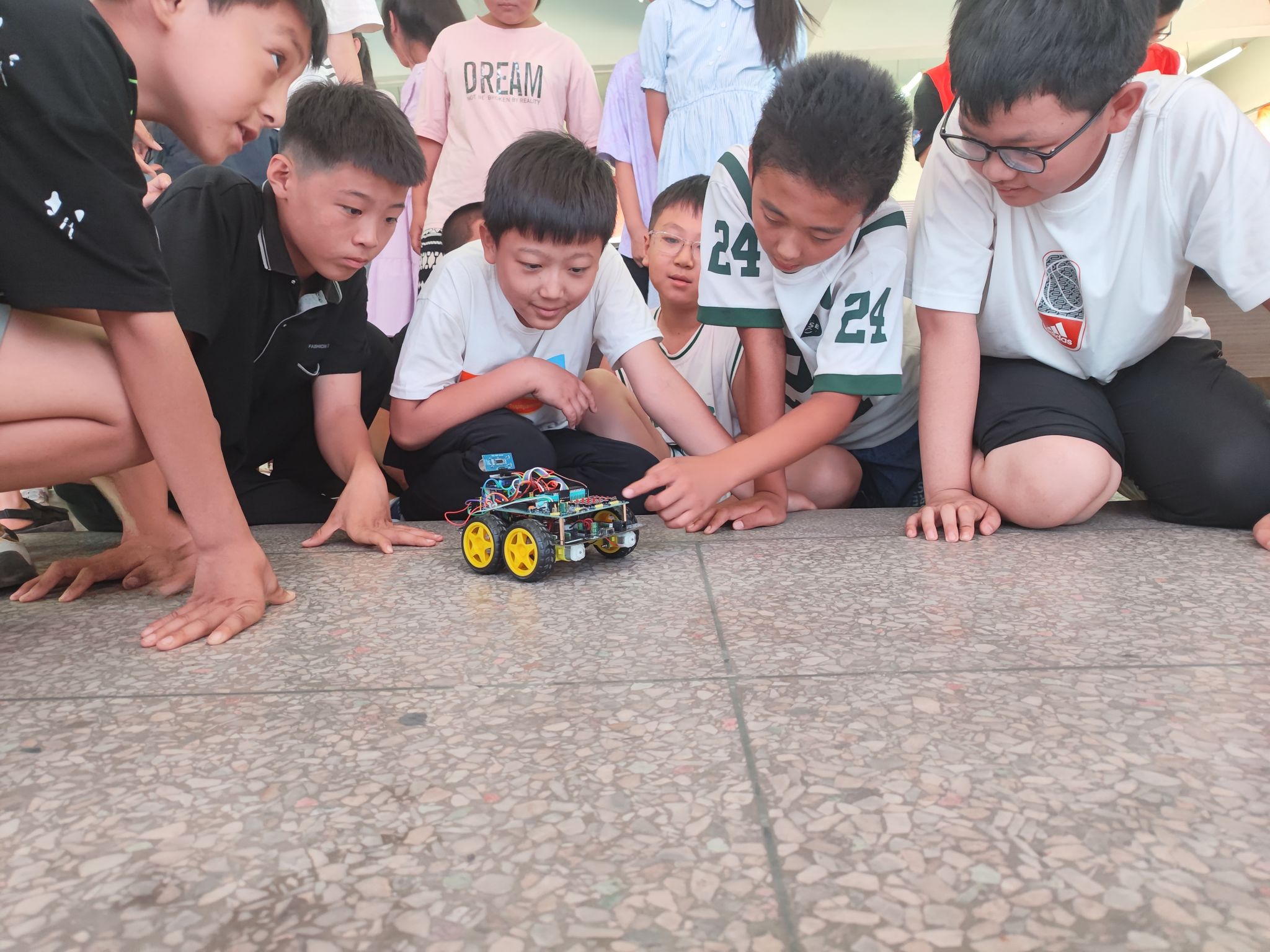 随后,实践团成员郭文瑞向小朋友们展示了科技产物——“光电智能小车”。为小朋友们讲解小车自动行走的原理和用到的知识点,用通俗易懂、幽默风趣的语言展示专业知识在实践中的运用,孩子们纷纷赞叹于小车的自动行驶功能。实践团成员们耐心解答孩子们的疑问,激发了一些孩子对代码编写的兴趣,对科技力量充满好奇。
