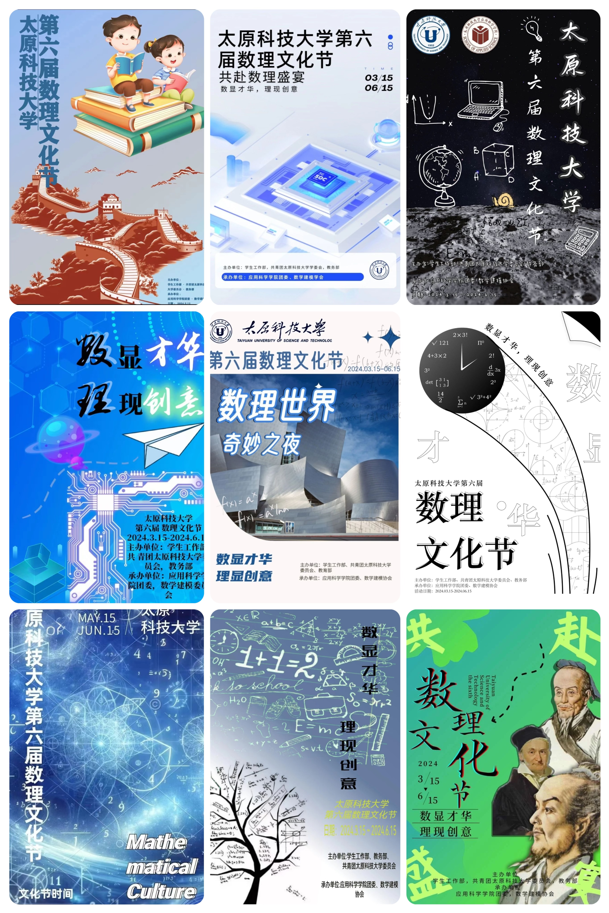 参赛者们充分发挥想象力,创作出了一幅幅精美绝伦的海报作品。他们融合数理文化,通过创意的图像、符号和布局,宣传太原科技大学第六届数理文化节;他们注重美学与信息传递的结合,让作品不仅具有独特的视觉效果,更蕴含着深刻的内涵和寓意;他们通过图片和文字的巧妙结合,有效地展现了主题的内涵与外延。在评选环节中,由评审团初步筛选出优秀作品后,发布应用科学学院官方平台,采用投票方式,评选出以下优秀作品。