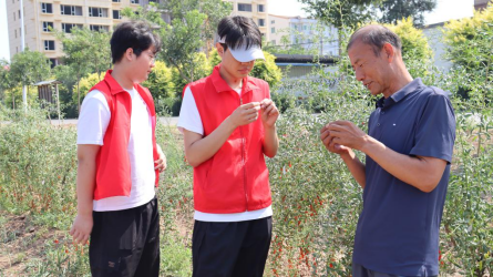 当清晨第一缕阳光洒满大地,实践团队员在村干部的带领下来到了大棚农业种植基地。首先映入眼帘的是枸杞园,一排排整齐的枸杞树挂满了饱满丰硕的果实,宛如点点繁星镶嵌在翠绿的枝叶间。实践团成员仔细观察枸杞的生长环境,深入了解枸杞的生长周期与销售渠道。