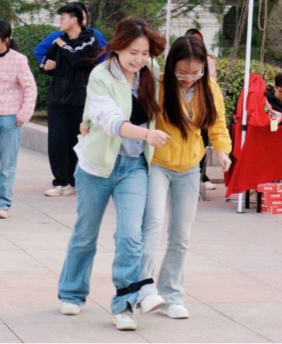 如果说“滚雪球”是团队不断膨胀的欢乐裂变,那么“二人三足”便是将信任浓缩成毫米级的精准。当两人的脚被紧紧绑在一起,这不仅是步伐的协调,更是默契的考验。每一步的迈出,都需要和队友同频共振,感受彼此的节奏与力量。随着工作人员的哨声响起,他们如同双翼齐飞的鸟儿,轻盈而坚定地迈向终点。有的组合步伐矫健,默契十足,如同在舞台上演绎一曲优美的双人舞;有的组合则稍显蹒跚,但彼此扶持,共同前行,诠释着团结与坚持的真谛。比赛过程中,不时传来同学们的加油声和欢笑声,整个场地沉浸在一片欢乐的氛围中。