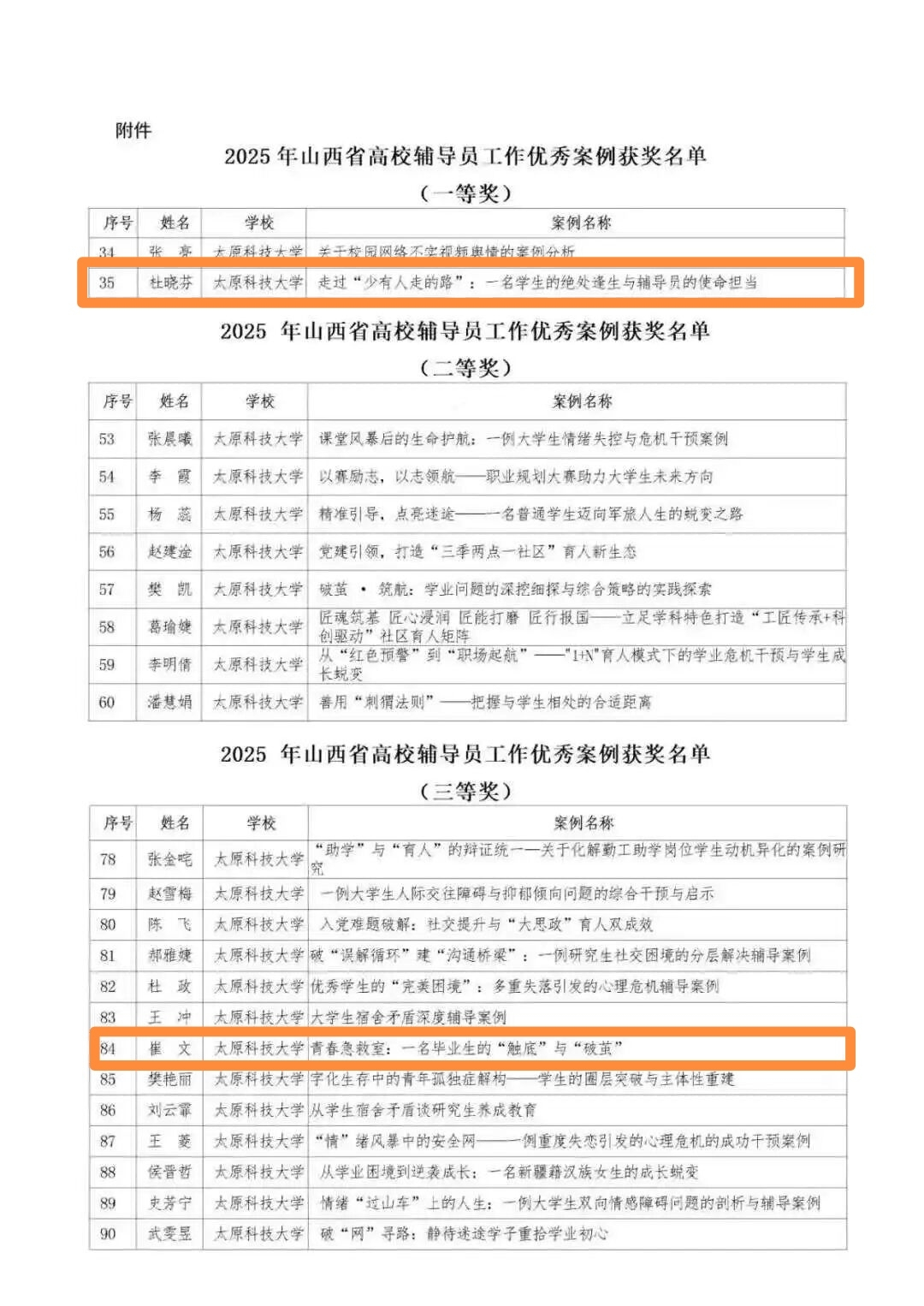 近日,2025年山西省高校辅导员工作优秀案例评选结果正式公布。我院两名辅导员在全省高校的激烈角逐中脱颖而出,荣获佳绩。其中杜晓芬老师的案例荣获一等奖,崔文老师的案例荣获三等奖,这一成果不仅彰显了学院学生工作队伍的专业水平与育人成效,更是学院以党建引领,扎实推进“党建规范提升行动”,深化党建与立德树人工作深度融合的生动实践。