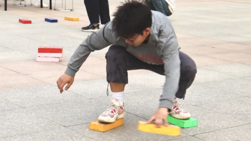 赛场上,一“河”之间,三砖横渡。随着裁判一声哨响,选手齐齐弓身屈膝,紧攥着两块“石头”,交替移动“石头”前行,双脚全程不允许接触地面。比赛过程中,选手们各显神通,有的采取“远中求胜”策略,迅速将第三个砖块扔得极远,一步跨上去,再将另一块砖拿起,动作大开大合,潇洒不已,不过几大步就走完了全程;有的则采取“稳中求胜”策略,三块“石头”如翩飞的蝴蝶,不停在脚下翻飞腾挪,灵活敏捷,动作行云流水。彼时,春风裹挟着此起彼伏的“加油”掠过比赛场地,回荡不息,声浪如松涛般在人群头顶翻涌,经久不绝,欢乐与鼓舞高扬,热情与友谊同燃。