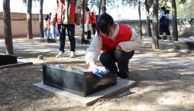 他们半跪在墓前,用抹布轻轻拂去碑身上的尘埃,指尖触碰历史留下的刻痕,仿佛在倾听先烈们的无声诉说。志愿者赵泽辉同学感慨:“当抹布擦过‘烈士永垂不朽’几个烫金大字时,突然意识到这不仅是清洁,更是守护民族记忆的责任,擦拭时仿佛能听见历史的回响,提醒我们和平年代的幸福来之不易。”